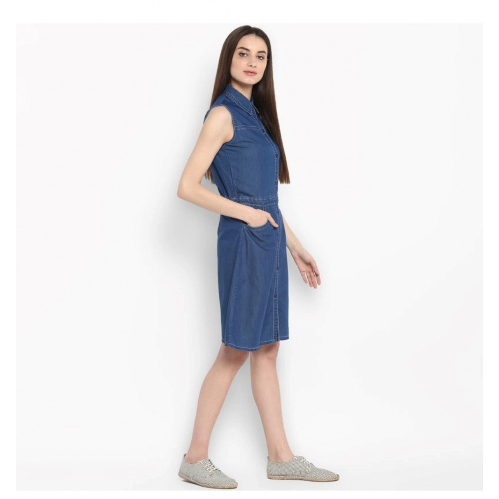 Generic Women's Denim Solid Sleeveless Above Knee Dress (Blue)
