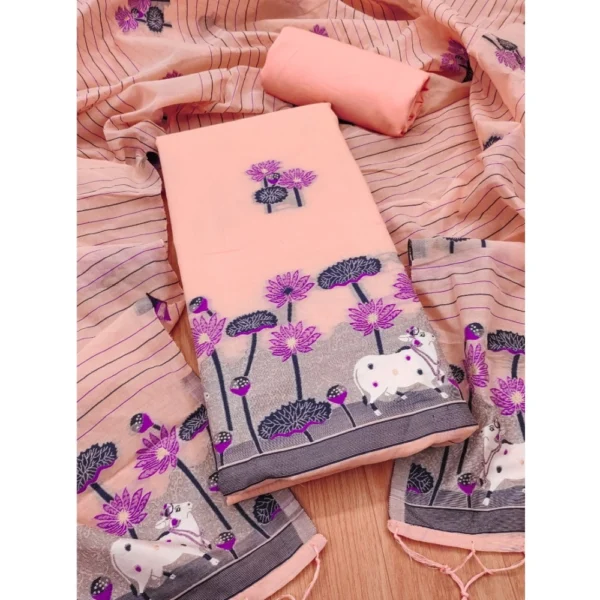Generic Women’s Banarasi Silk Printed Unstitched Salwar Suit Material With Dupatta (Peach, 3Mtrs)