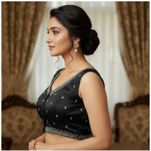 Generic Women’s Jacquard Zari Round Neck Padded Blouse (Black 38 Ready (Self Alterable 36–40)