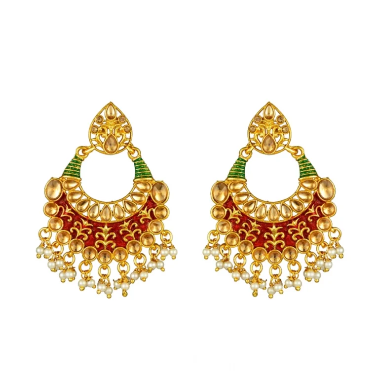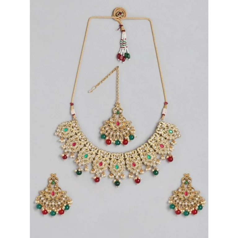 Generic Women’s Rose Gold Plated Alloy Kundan Earrings & Mangtikka (Red & Green)