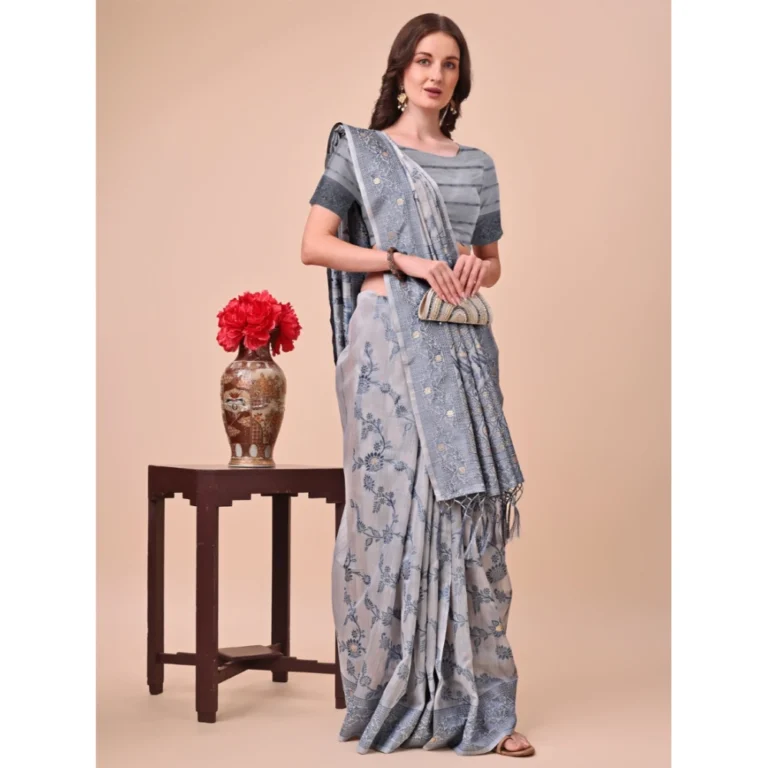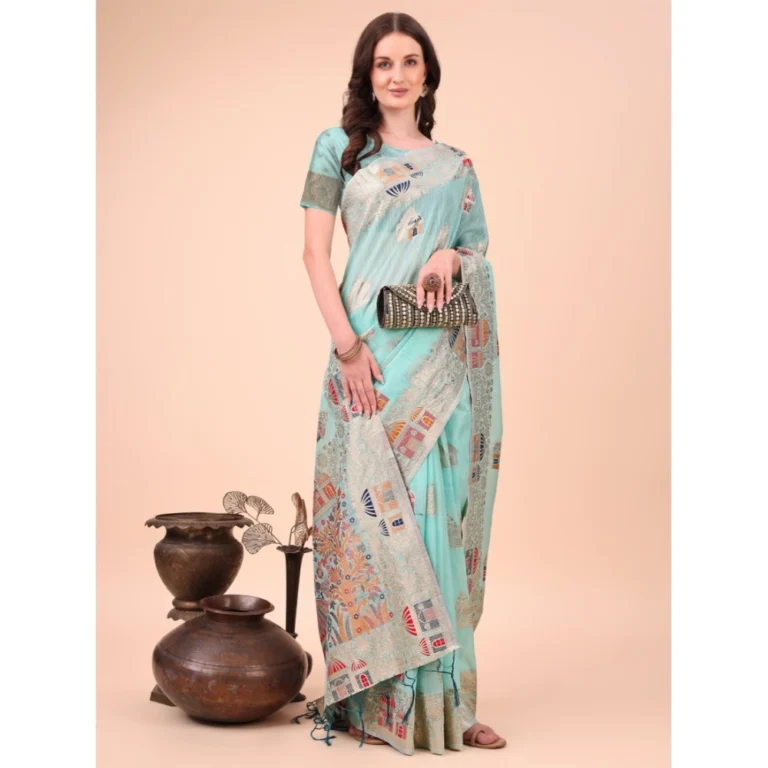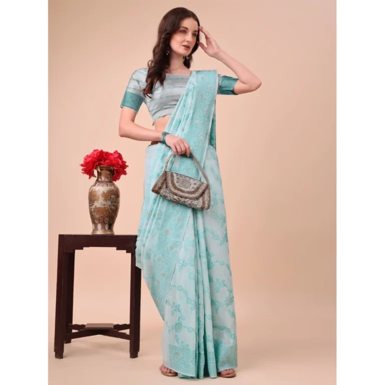 Generic Women’s Linen Cotton Printed Saree With Unstitched Blouse 5.5Mtr (Sky Blue)