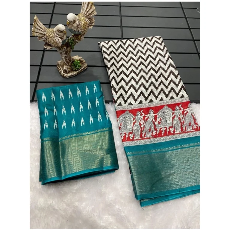 Generic Women’s Soft Dola Cotton Kalamkari Printed Saree With Unstitched Blouse 5.5Mtr (Turquoise)