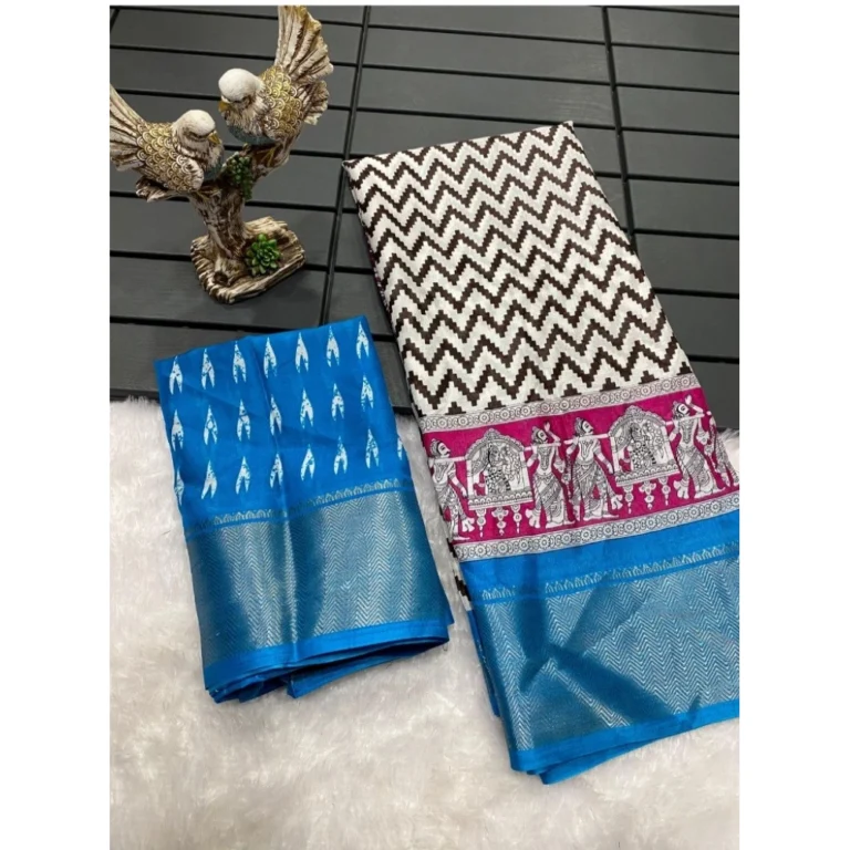 Generic Women’s Soft Dola Cotton Kalamkari Printed Saree With Unstitched Blouse 5.5Mtr (Sky Blue)