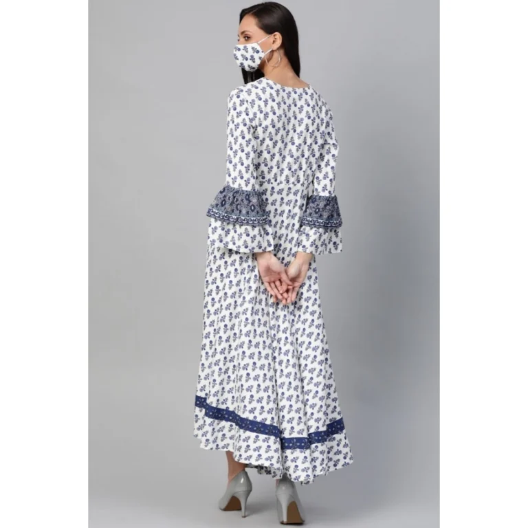 Generic Women’s Casual Bell Sleeve Floral Printed Rayon Dress (White & Blue)