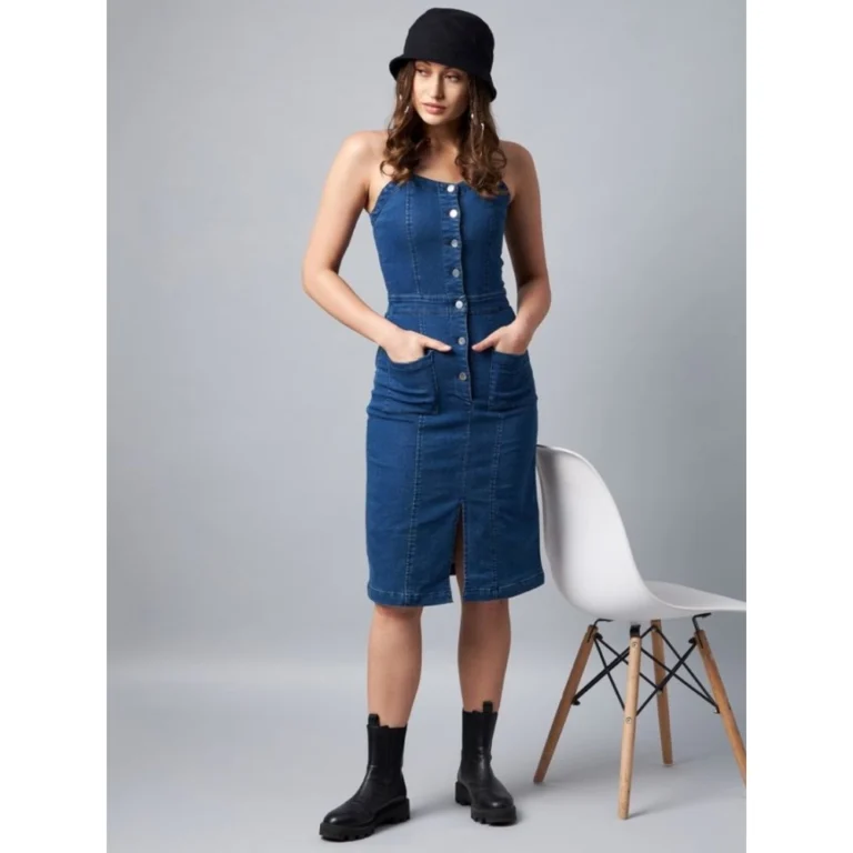 Generic Women’s Denim Lycra Solid Square Neck Shoulder Straps Dress (Blue)