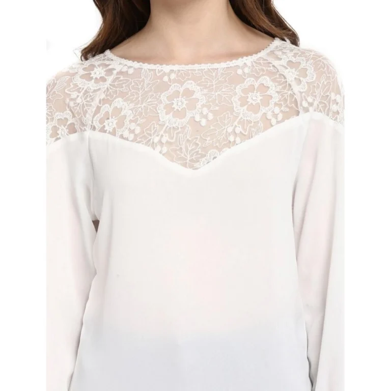 Generic Women’s Polyester Georgette Self Design 3-4th Sleeves Regular Top (White)