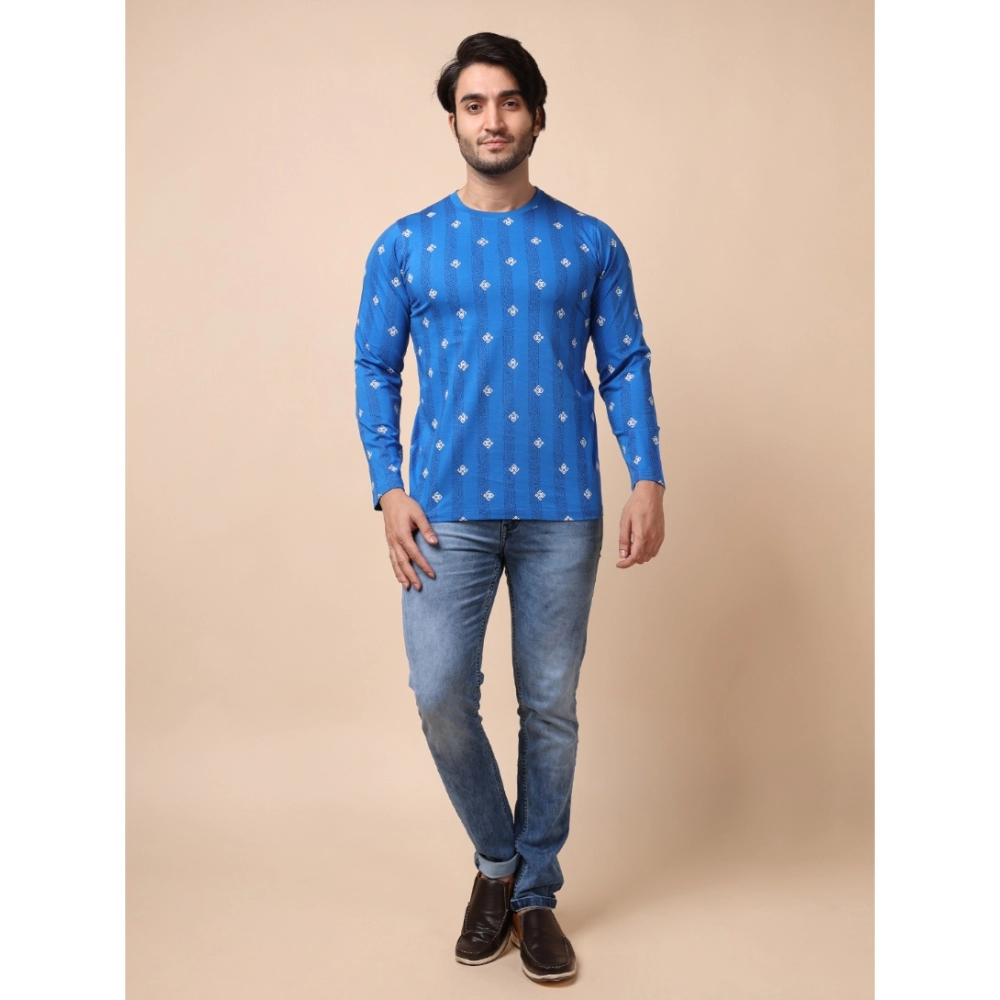 Generic Men’s Casual Cotton Printed Round Neck Full Sleeve T-Shirt (Blue)
