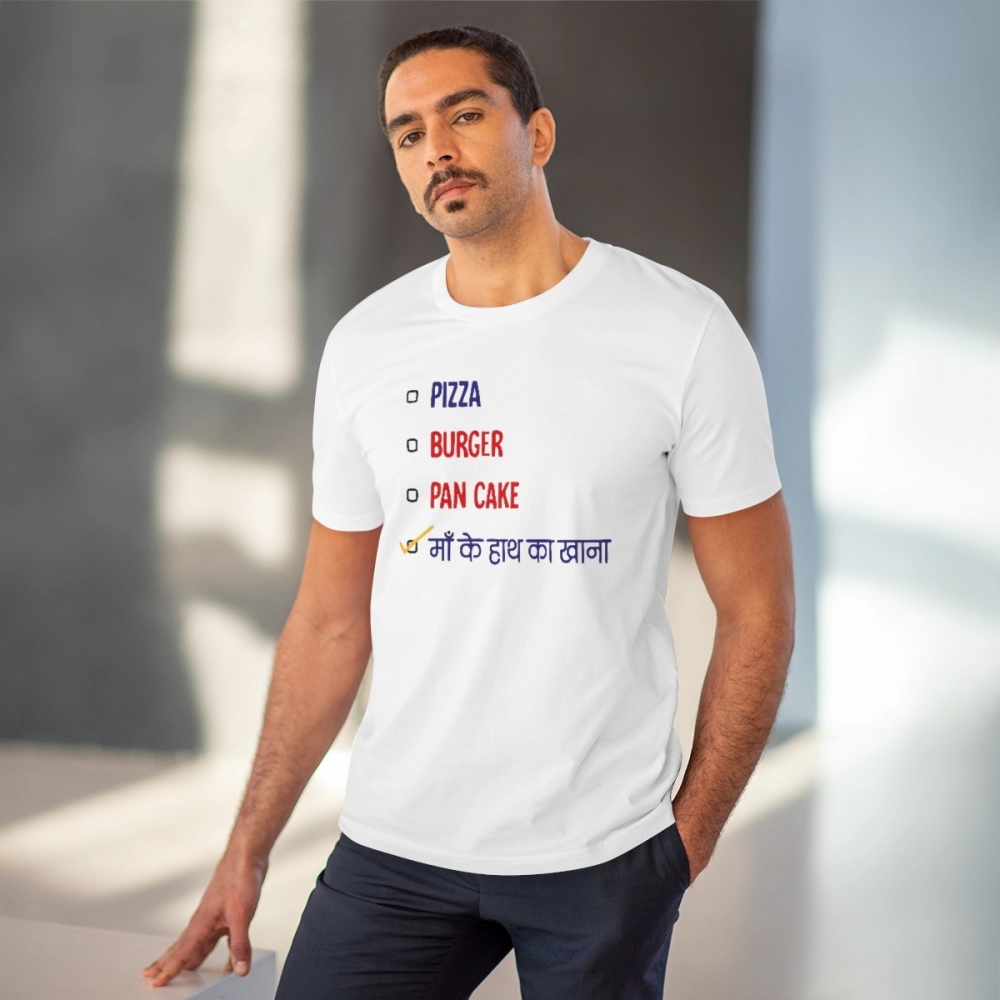Men’s PC Cotton Pizza Burger Pan Cake Maa Ke Hath Ka Khana Printed T Shirt (Color: White, Thread Count: 180GSM)