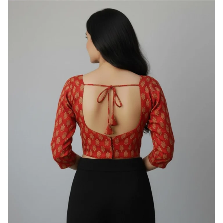 Generic Women’s Jacquard Zari Round Neck Padded Blouse (Red 38 Ready (Self Alterable 36–40)