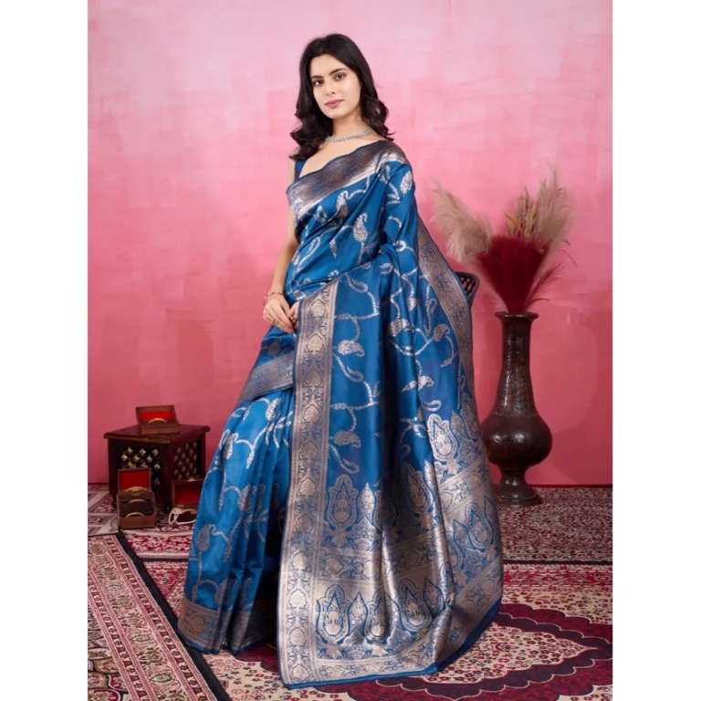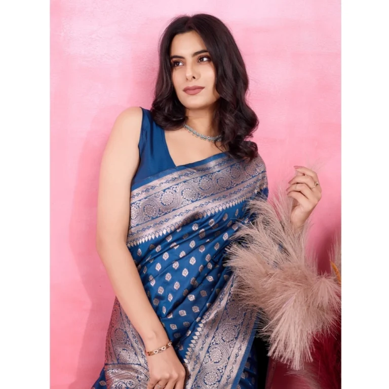 Generic Women’s Banarasi Silk Printed Saree With Unstitched Blouse 5.5Mtr (Blue)