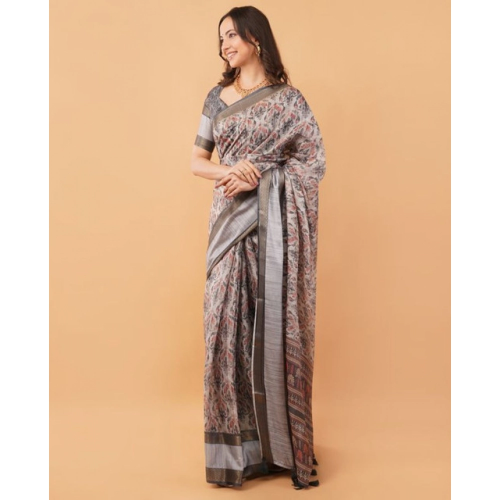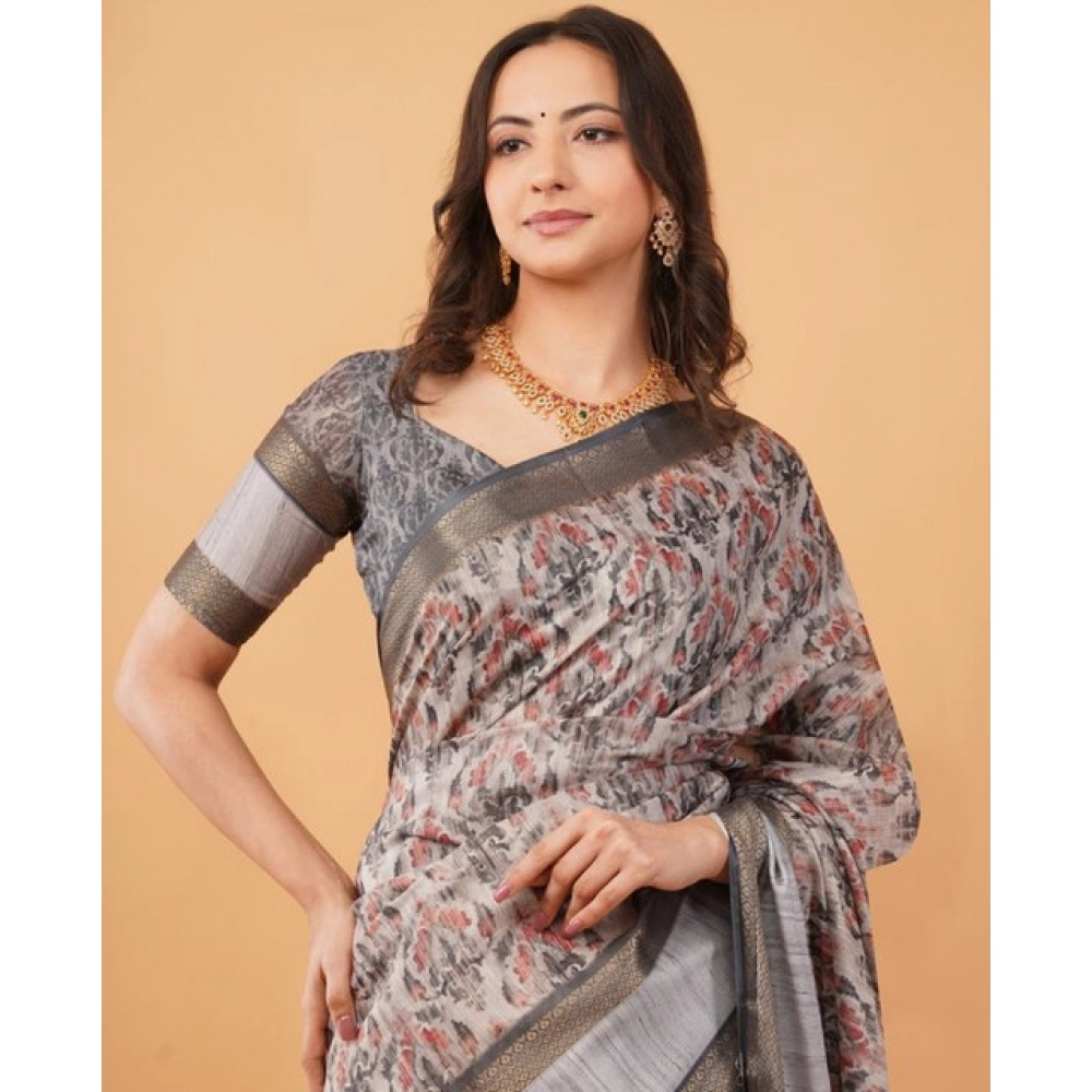 Generic Women's Polyester Printed Saree With Unstitched Blouse 5.5 Mtr (Grey)