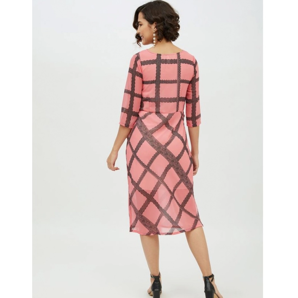 Generic Women’s Polyester Checkered 3-4th Sleeves Below Knee Dress (Pink)