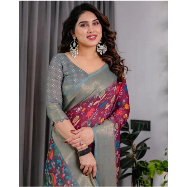 Generic Women’s Linen Printed Saree With Unstitched Blouse 5.5Mtr (Purple)